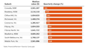 ਮੈਲਬਰਨ : ਸਿਡਨੀ ਦੇ ਸਭ ਤੋਂ ਅਮੀਰ ਸਬਅਰਬਸ ਵਿੱਚ ਔਸਤਨ ਮਕਾਨ ਦੀਆਂ ਕੀਮਤਾਂ ਵਿੱਚ ਵੱਡੀ ਗਿਰਾਵਟ ਵੇਖੀ ਗਈ ਹੈ। ਕੁਝ ਇਲਾਕਿਆਂ ਵਿੱਚ ਪਿਛਲੇ ਤਿੰਨ ਮਹੀਨਿਆਂ ਵਿੱਚ 288,000 ਡਾਲਰ ਤੱਕ ਦੀ ਗਿਰਾਵਟ ਆਈ ਹੈ। CoreLogic ਦੇ ਅੰਕੜਿਆਂ ਅਨੁਸਾਰ, ਉੱਚ ਵਿਆਜ ਦਰਾਂ ਅਤੇ ਘੱਟ ਉਧਾਰ ਲੈਣ ਦੀ ਸਮਰੱਥਾ ਨੇ ਉੱਪਰਲੇ-ਅੰਤ ਬਾਜ਼ਾਰ ਨੂੰ ਕਮਜ਼ੋਰ ਕਰ ਦਿੱਤਾ ਹੈ। ਅੰਦਰੂਨੀ ਮੈਲਬਰਨ ਦੇ ਸਬਅਰਬ ਮਿਡਲ ਪਾਰਕ, ਕਲਿਫਟਨ ਹਿੱਲ ਅਤੇ ਸਾਊਥ ਮੈਲਬਰਨ ਵਿਚ ਕੀਮਤਾਂ ’ਚ 100,000 ਡਾਲਰ ਤੋਂ ਵੱਧ ਦੀ ਗਿਰਾਵਟ ਆਈੇ।