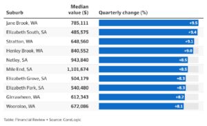 ਹਾਲਾਂਕਿ, ਵਧੇਰੇ ਕਿਫਾਇਤੀ ਉਪਨਗਰਾਂ ਵਿੱਚ ਵਾਧਾ ਜਾਰੀ ਹੈ। ਪਰਥ ਦੇ ਜੇਨ ਬਰੂਕ, ਸਟ੍ਰੈਟਨ ਅਤੇ ਹੇਨਲੀ ਬਰੂਕ ’ਚ ਮਕਾਨਾਂ ਦੀਆਂ ਕੀਮਤਾਂ 9٪ ਵਧੀਆਂ। ਐਡੀਲੇਡ ਦੀ ਐਲਿਜ਼ਾਬੈਥ ਸਾਊਥ ‘ਚ 9.4 ਫੀਸਦੀ ਦਾ ਵਾਧਾ ਦਰਜ ਕੀਤਾ ਗਿਆ। ਬ੍ਰਿਸਬੇਨ ਦੇ ਵਨ ਮੀਲ ’ਚ 7.7٪ ਦਾ ਵਾਧਾ ਅਤੇ ਸਿਡਨੀ ਦੇ ਕੈਬਰਾਮਾਟਾ ਵੈਸਟ ’ਚ 7.1٪ ਦਾ ਵਾਧਾ ਦਰਜ ਕੀਤਾ ਗਿਆ।