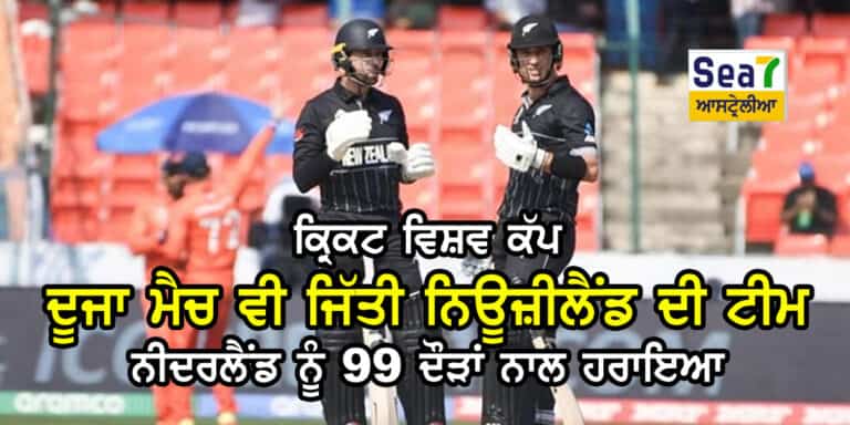 ਕ੍ਰਿਕਟ ਵਿਸ਼ਵ ਕੱਪ : ਦੂਜਾ ਮੈਚ ਵੀ ਜਿੱਤੀ ਨਿਊਜ਼ੀਲੈਂਡ ਦੀ ਟੀਮ, ਨੀਦਰਲੈਂਡ ਨੂੰ 99 ਦੌੜਾਂ ਨਾਲ ਹਰਾਇਆ